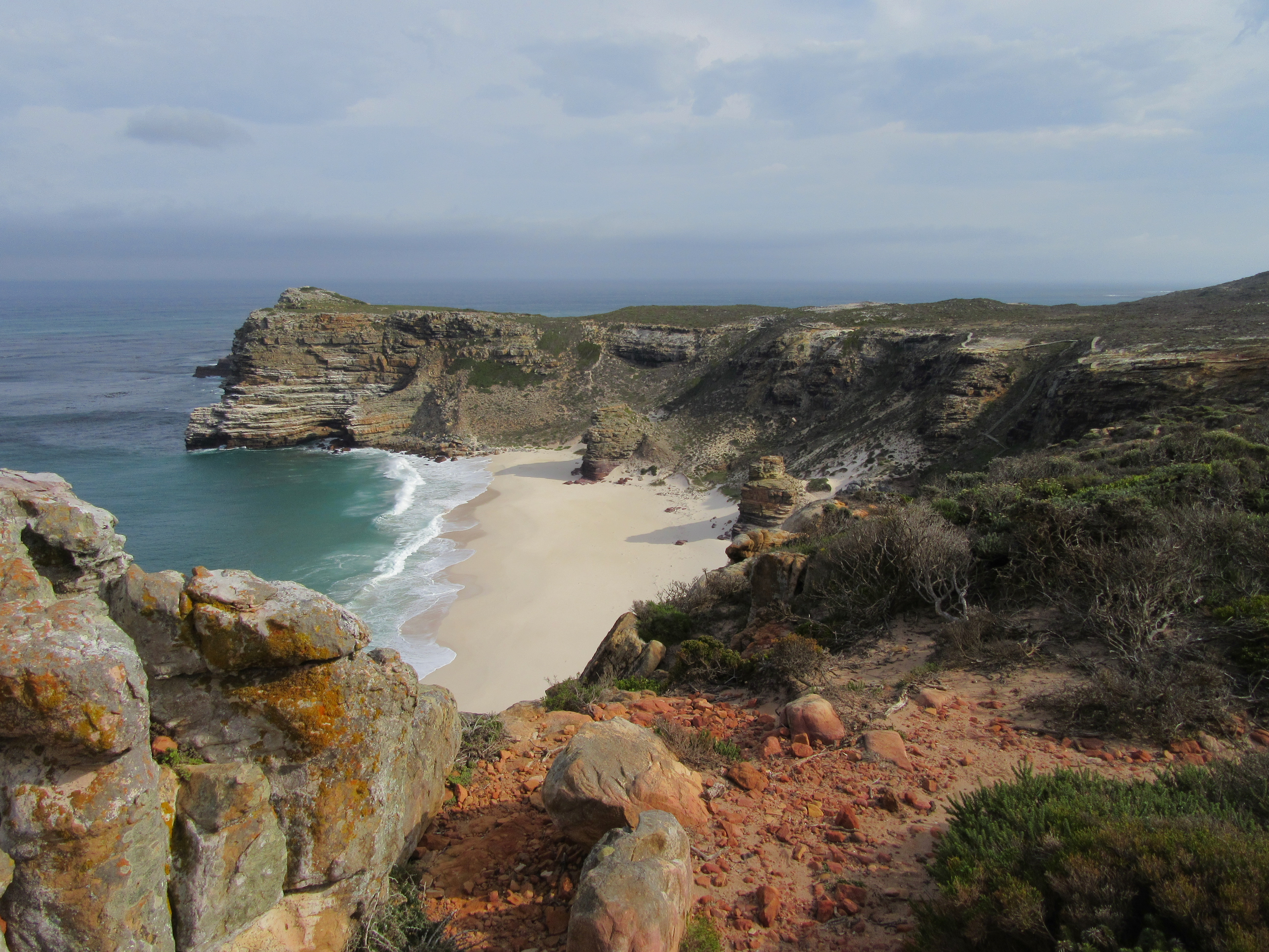 Along the way, I was tempted by the beach between Cape Point and the Cape of Good Hope, which was strangely abandoned. This was Dias Beach, named after the explorer Bartolomeu Dias, who first rounded the Cape in 1488. He originally named it "The Cape of Storms," but the weather was fine when we were there. The beach looked incredibly inviting from up on the path, with white sand and deep blue tumbling waves. And yet there was no one down there enjoying it! Kelsey, another student on the trip, and I decided to take a detour to check it out.
