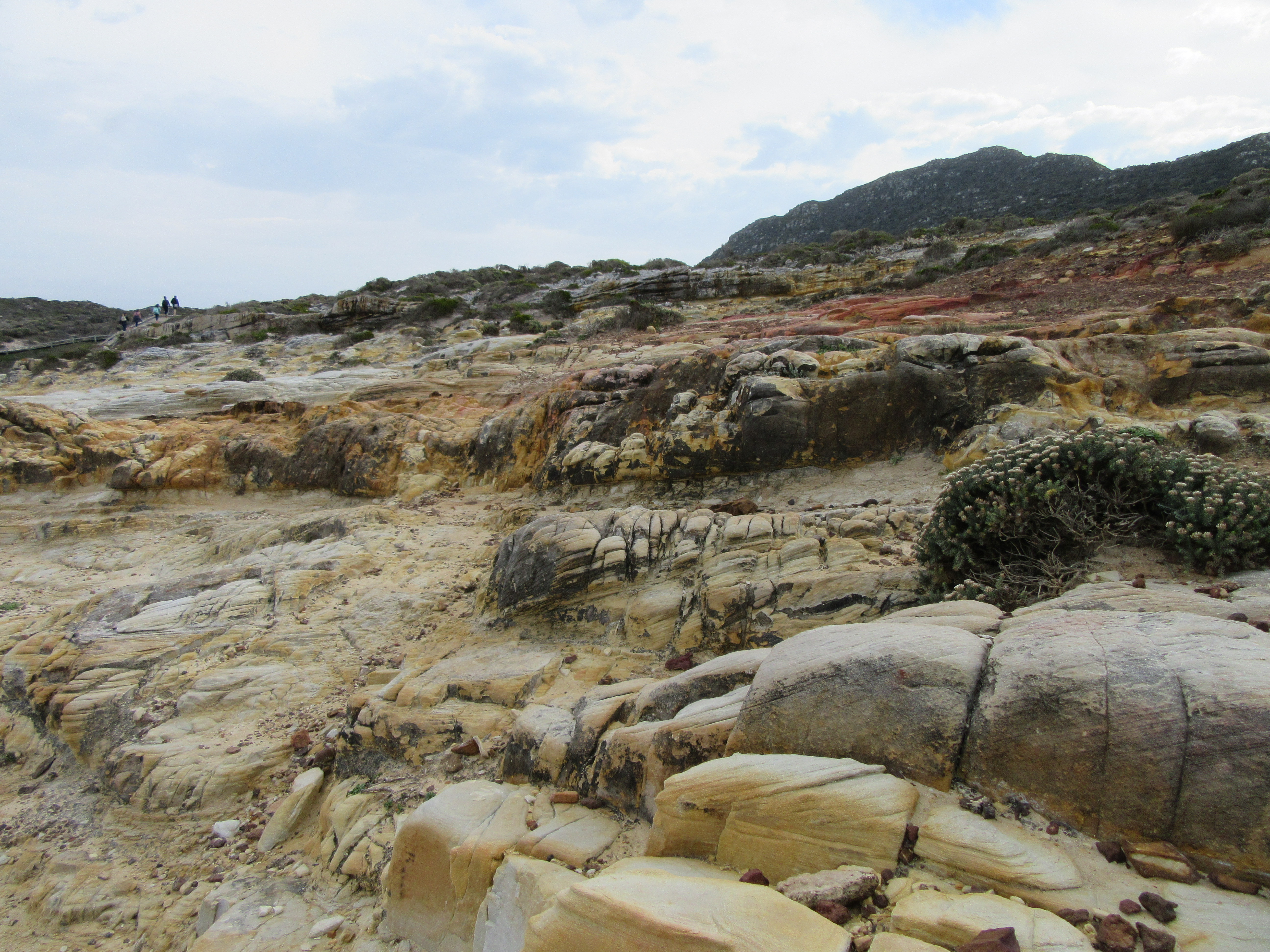 After a brief trip up to the lighthouse to look around, I set out to hike the rest of the way to the Cape of Good Hope itself. It's an easy walk along the edge of the escarpment, with plenty of time to enjoy the ocean views and the colors of the surrounding rocks. Like the Grand Canyon, the rocks are sandstone and striped with brilliant colors.