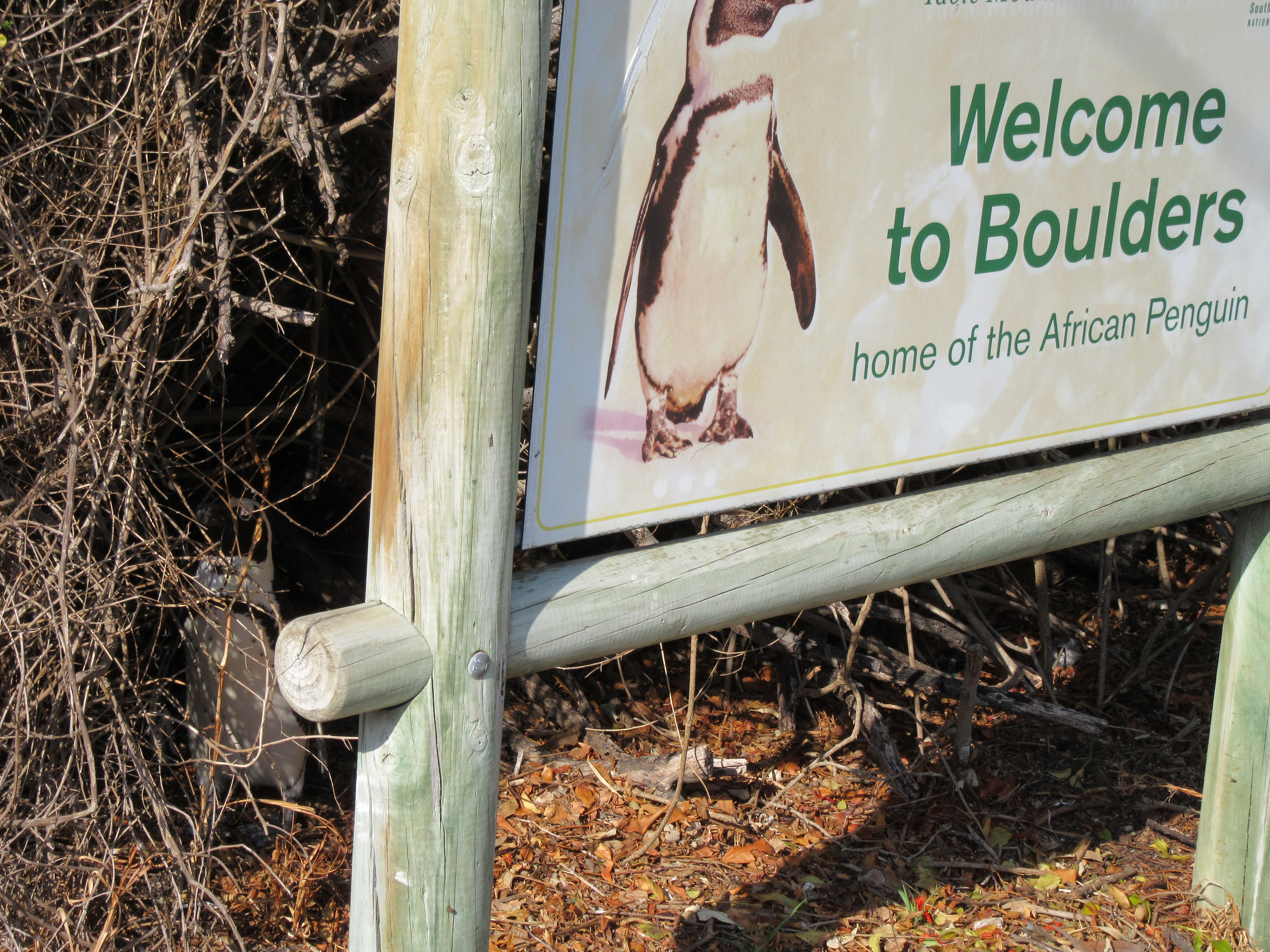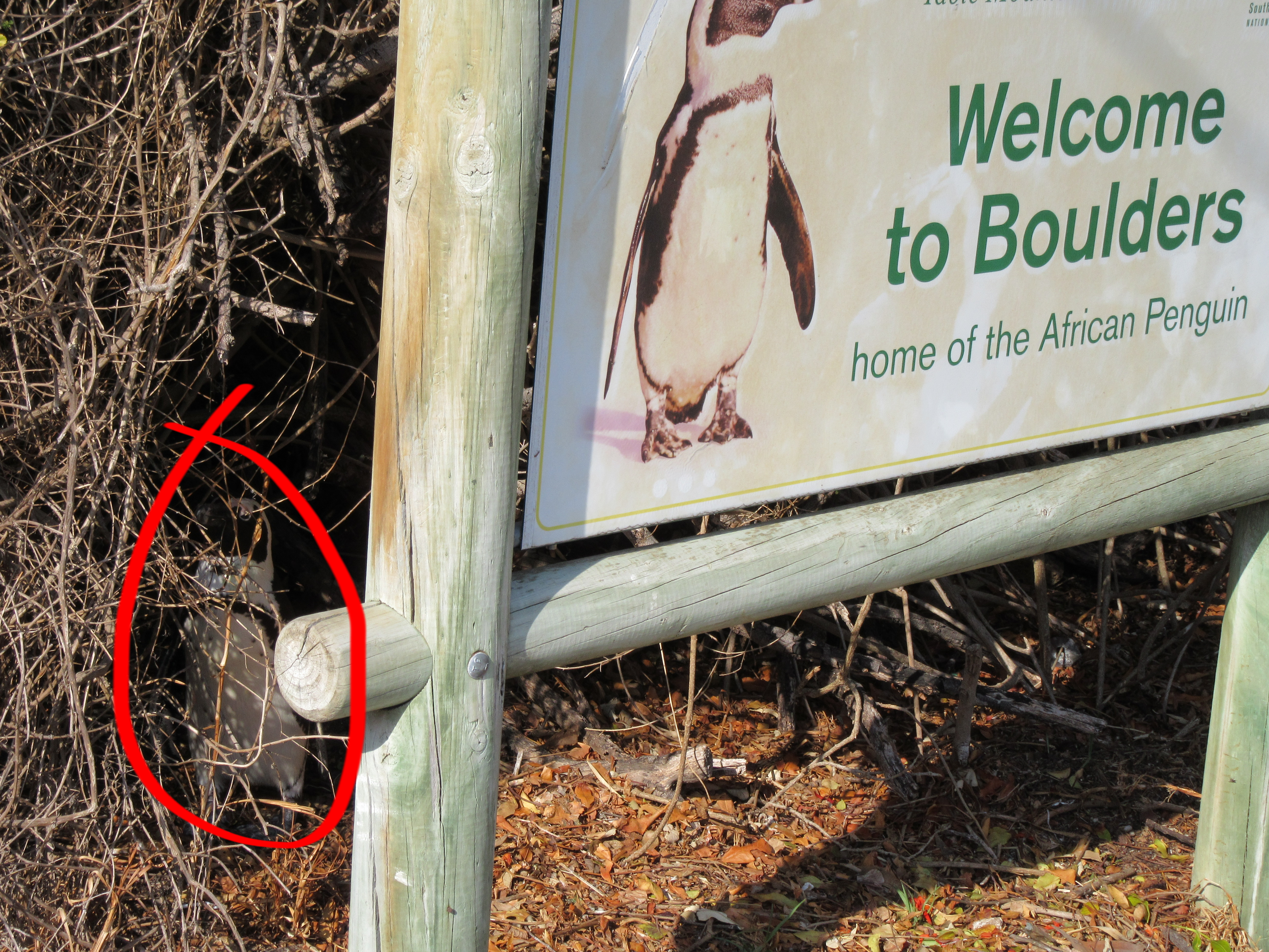 As it turned out our first opportunity to make the acquaintance of penguins came before we even got to the entrance. Wandering down the middle of the street, ignored by the curio vendors setting up shop, was a single lost, presumably very confused, penguin. It saw us coming and made for the bushes just behind the Boulders Beach sign. It must have realized the gravity of its mistake as more and more tourists came tramping down the street just outside its hiding place, because it was still lurking there when we left.